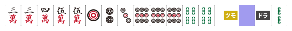 この形をリーチしてツモでアガることができれば、「リーチ、ツモ、タンヤオ、ピンフ、三色同順、一盃口、ドラ2」の9翻で倍満です。